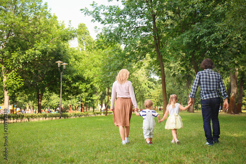 © Pixel-Shot, Obraz premium Happy family walking in green park