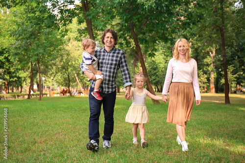 © Pixel-Shot, Obraz premium Happy family walking in green park