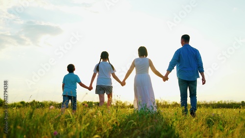 © Victoriia, Fototapeta premium Happy family walks through green meadow, unity, support, cohesion, slow motion. Parents father mother, children daughter son hold hands, family picnic in nature. People enjoy freedom of outdoors, sky
