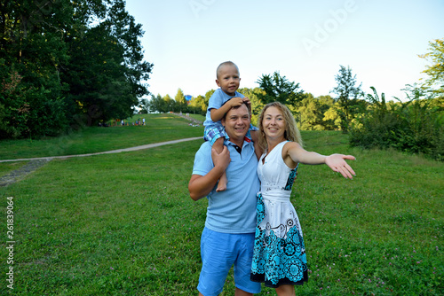 Naklejka premium Happy family with a child walking in the Park outdoors. A little boy is sitting on his father's neck, and his mother looks and shows his hand to the side. The concept of family happiness. Portrait