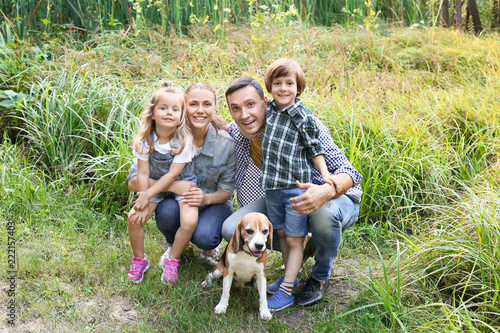 © Pixel-Shot, Obraz premium Happy family with cute dog resting in park