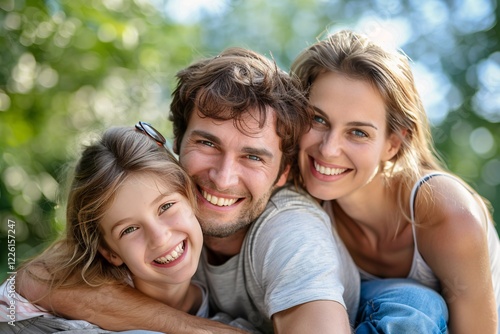 Obraz premium Happy family with one child smiling and embracing outdoors in a park