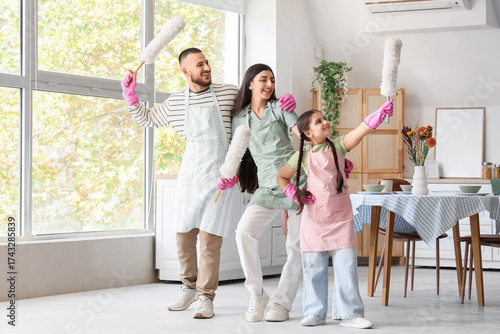 Naklejka premium Happy family with pp-dusters dancing while cleaning in kitchen