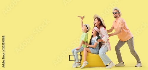 Fototapeta premium Happy family with suitcase on yellow background with space for text. Travel...