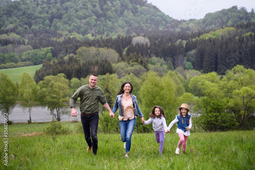 Obraz premium Happy family with two small daughters running outdoors in spring nature.