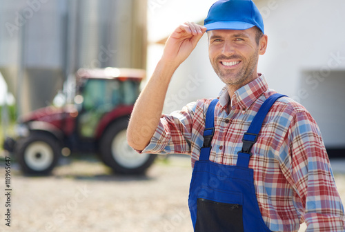 © gpointstudio, Fototapeta premium Happy farmer and his big farm