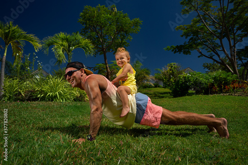 © Oleg, Obraz premium Happy father doing push up exercise with daughter on back in park