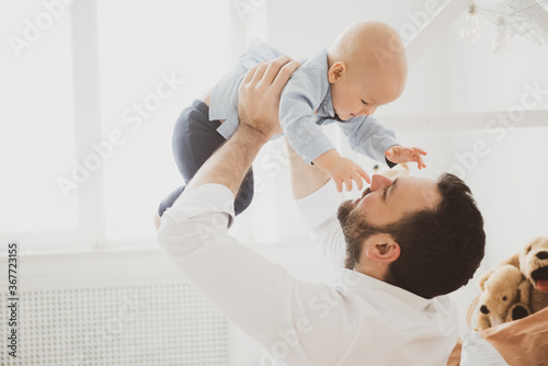 Fototapeta premium Happy father holding little baby son. Fatherhood concept