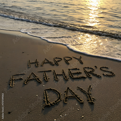 © Hilman Parid Mubaroq, Fototapeta premium Happy Father's Day message written in the sand on a beach at sunrise.