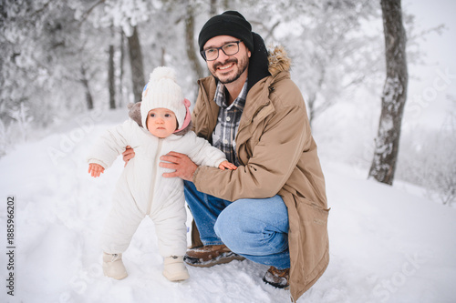 © Serhii, Obraz premium Happy father teaching baby walking in winter