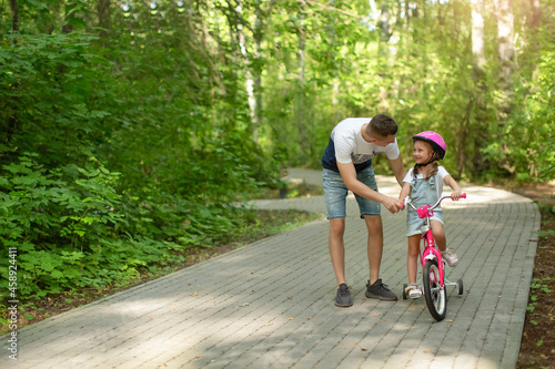 Fototapeta premium Happy father teaching his little daughter to ride a bicycle. Child learning...