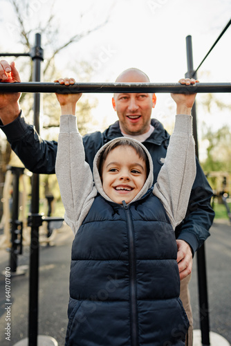 © fotofabrika, Fototapeta premium Happy father with his son spending time together on a sports ground
