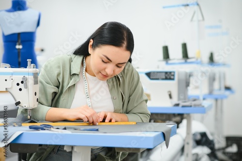 © Serhii, Obraz premium Happy female dressmaker working with sewing machine at textile factory.