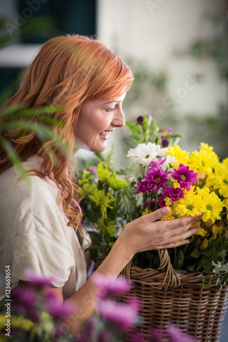 © WavebreakmediaMicro, Fototapeta premium Happy female florist holding basket of flowers