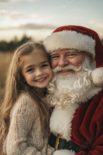 Obraz premium Happy festive season, сute child girl pleased with santa claus. Christmas ad campaign idea artwork for media and online use. Winter cheer promotions. Xmas festive banners. Merry xmas banners.