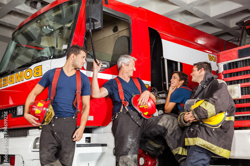 Fototapeta premium Happy Firefighters Conversing While Leaning On Trucks
