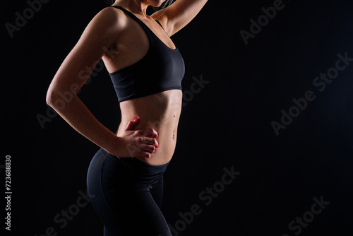 © Ivan Zelenin, Fototapeta premium Happy fit woman over studio background. Smiling female fitness workout. Healthy lifestyle concept.