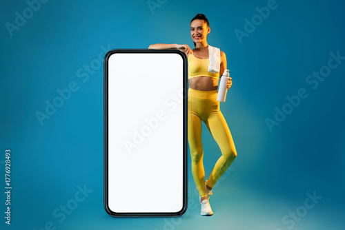 © Prostock-studio, Naklejka premium Happy fitness woman in yellow activewear stands by a large smartphone with a blank screen. She holds a water bottle, ready for her workout in a bright blue studio.