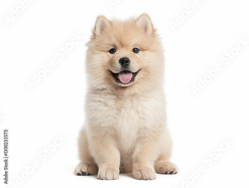 © focuslyimg.com, Obraz premium Happy fluffy puppy sitting proudly with bright expression in cozy indoor setting