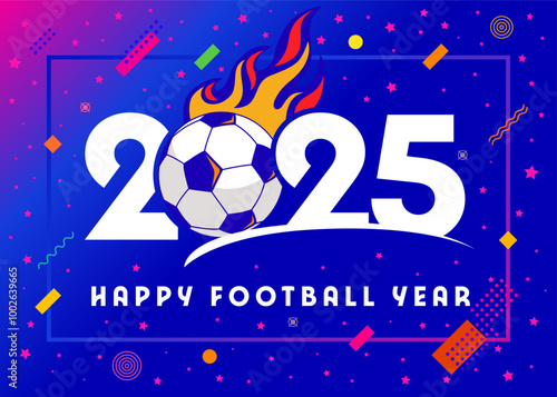 Naklejka premium Happy football year 2025 with a flaming soccer ball. Premium logo concept with numbers and sport ball for football tournament or competition schedule. Colorful vector calendar design 2025