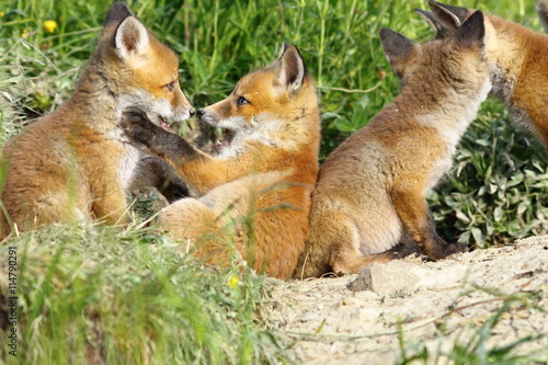 © taviphoto, Fototapeta premium happy fox cubs playing near the den