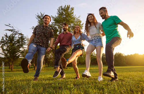 © Studio Romantic, Obraz premium Happy friends dancing and laughing outdoor. Joyful young people having fun and being silly on weekend in countryside