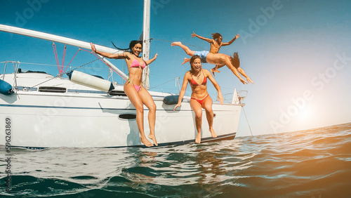 Obraz premium Happy friends diving from sailing boat into the sea - Soft focus on girls...