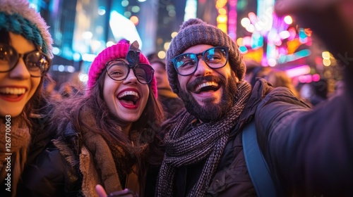 © Ika, Fototapeta premium Happy friends selfie in illuminated city night