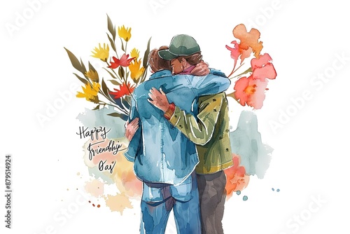 © STF Design , Fototapeta premium Happy Friendship day colorful typography vector illustration with cute hearts and friendship elements on a blue background. Friendship day poster, banner, greeting card template design.
