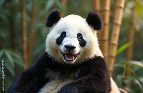 © miss irine, Naklejka premium Happy giant panda smiles with open mouth, showing pure joy. Cute wild animal poses within natural bamboo habitat. Beautiful mammal iconic black, white fur, truly lovely wild creature native to Asian