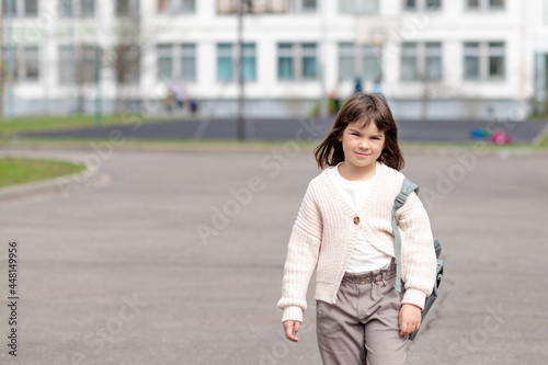 Fototapeta premium happy girl a schoolgirl of 8 years of European appearance with a backpack is walking in the school yard in the afternoon on the street looking at the camera closeup. High quality photo
