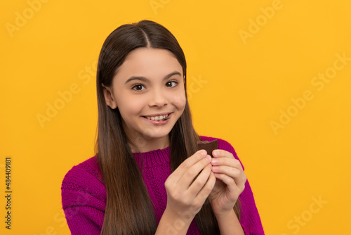 Fototapeta premium Happy girl child enjoy eating chocolate snack yellow background, tasty
