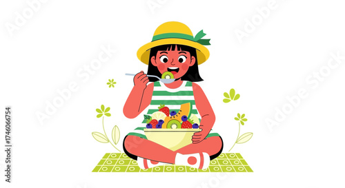 Naklejka premium Happy Girl Enjoying Fresh Fruits While Relaxing Outdoors In A Colorful Sunny Day