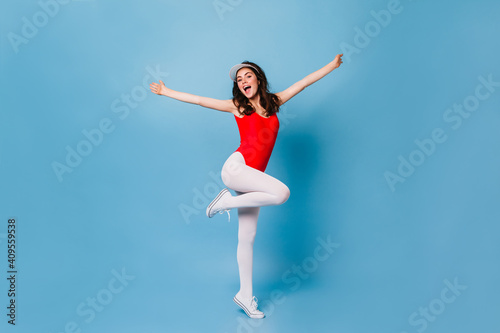 © Look!, Fototapeta premium Happy girl from 80s is having fun on blue background. Smiling brunette in sporty tight-fitting suit posing
