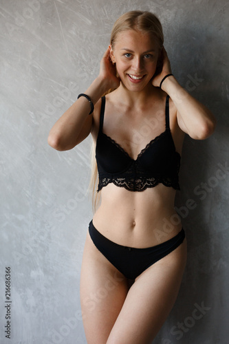 Fototapeta premium Happy girl.Girl smiles.In black lingerie near the wall