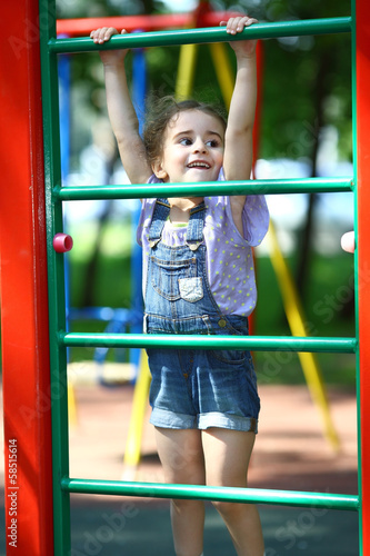 © Pavel Losevsky, Obraz premium Happy girl hanging on gymnastic wall on playground
