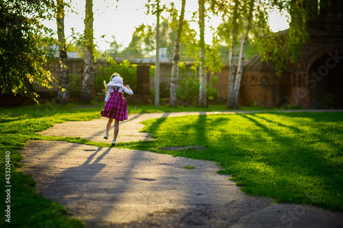 Fototapeta premium happy girl in purple dress, outdoor walks happy childhood selective focus