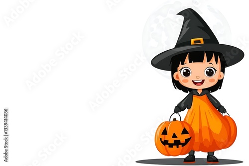 Fototapeta premium Happy girl in witch costume, carrying pumpkins, Halloween night, moonlit background, greeting card