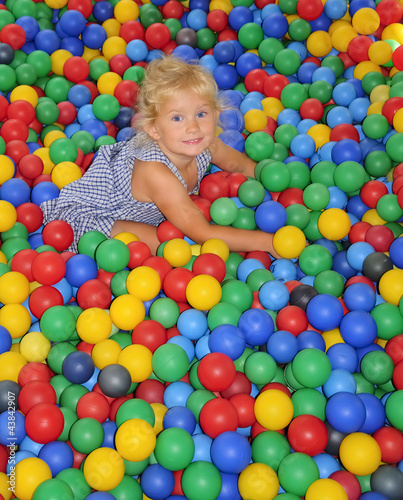 © itsmejust, Obraz premium Happy girl playing in balls.