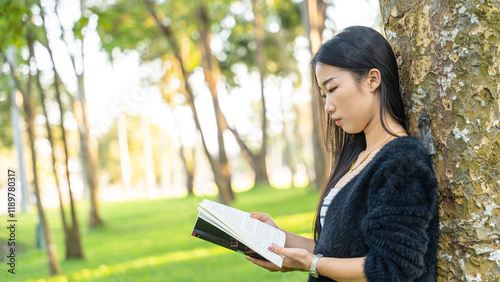 © banphote, Obraz premium Happy girl reading a book in park, concept of Relaxation.