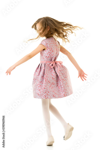 © lotosfoto, Naklejka premium Happy Girl with Long Hair Wearing Pink Dress Having Fun