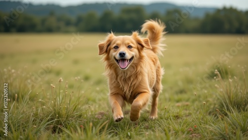 © wannakorn, Naklejka premium Happy Golden Dog Running Joyfully Through Lush Green Field Under Clear Sky