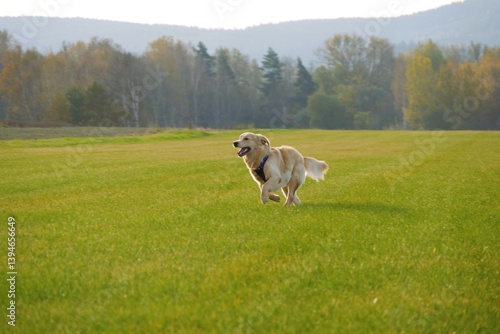 © Kacper, Fototapeta premium Happy golden retriever wearing a blue harness runs across a green field