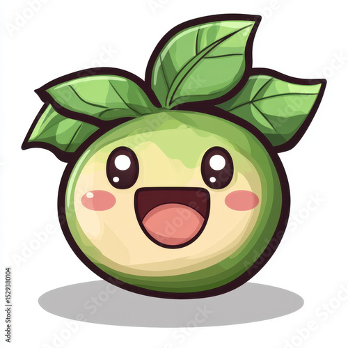 © Cholladda, Obraz premium Happy Green Cartoon Fruit Character with Leaves