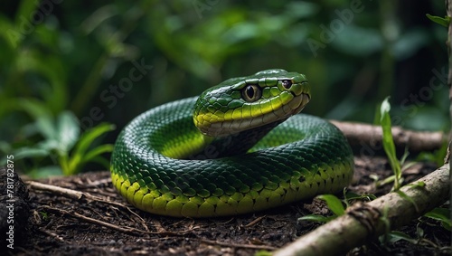 Obraz premium Happy green snake in the spring in the summer in the forest. Happy Chinese...