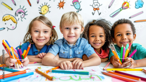 Fototapeta premium Happy group of diverse children drawing with colorful pencils, fostering creativity and friendship in a fun, educational setting.