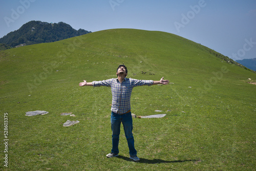 © Navaashay, Fototapeta premium Happy guy in high altitude green grassland during day time arms outstretched