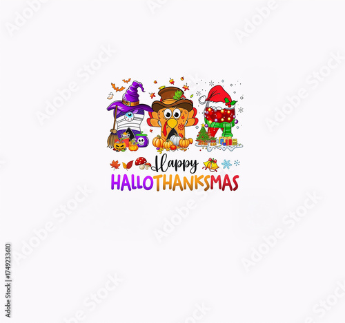 Fototapeta premium Happy HalloThanksmas Holiday Gnomes with Witch, Turkey, and Santa Outfits