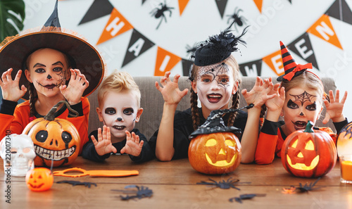 © JenkoAtaman, Obraz premium happy Halloween! a group of children in suits and with pumpkins in home