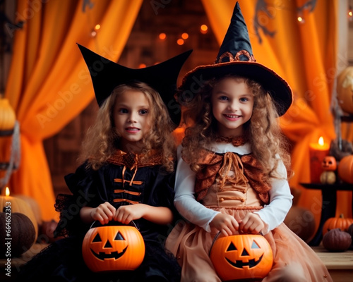 Fototapeta premium Happy halloween children in costumes and makeup holiday happy halloween